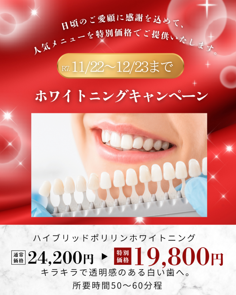 ハイブリッドホワイトニングキャンペーンが残り1週間ちょっととなりました☆ ご予約まだまだ受付けております(^o^) 黄ばみを落として、白い歯で新年をお迎えくださいね~!