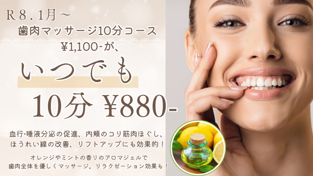 R7年は毎週火曜日はサービスデイとして、 歯肉マッサージ半額のサービスを行ってまいりましたが、 より多くの方にサービスを受けていただいきた思いから、 1月よりサービス内容を変更いたします(^o^) 曜日に関係なくいつでも、 歯肉マッサージ10分コース ¥880- となります☆ 20分コースは今まで通り¥2,200-です。 宜しくお願いいたします(^^)