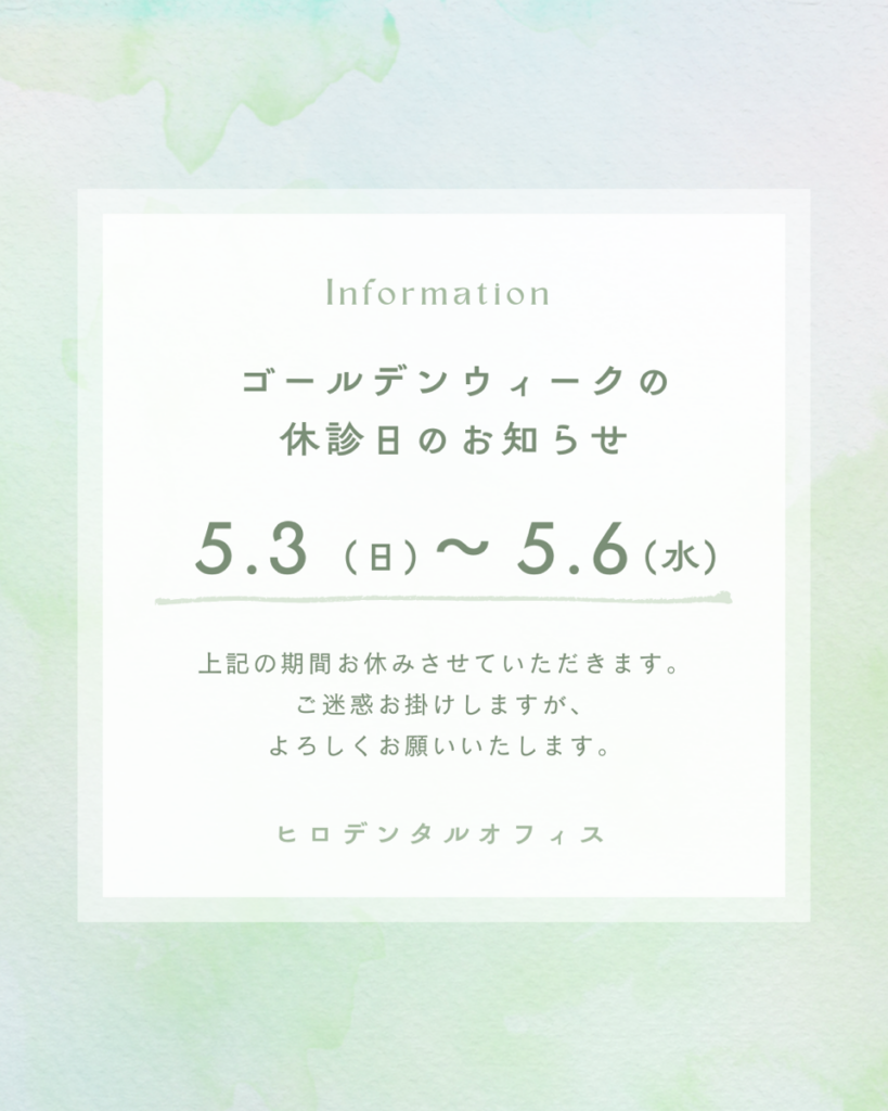 日頃より当院をご愛顧いただき、ありがとうございます。 GW中、5/3~5/6(水)までは休診いたします。 休診中は、 LINE ・インスタグラムのお返事はできません。 メッセージを頂いた方へは、休診日あけに順次ご返信させていただきます。 何卒よろしくお願いいたします。
